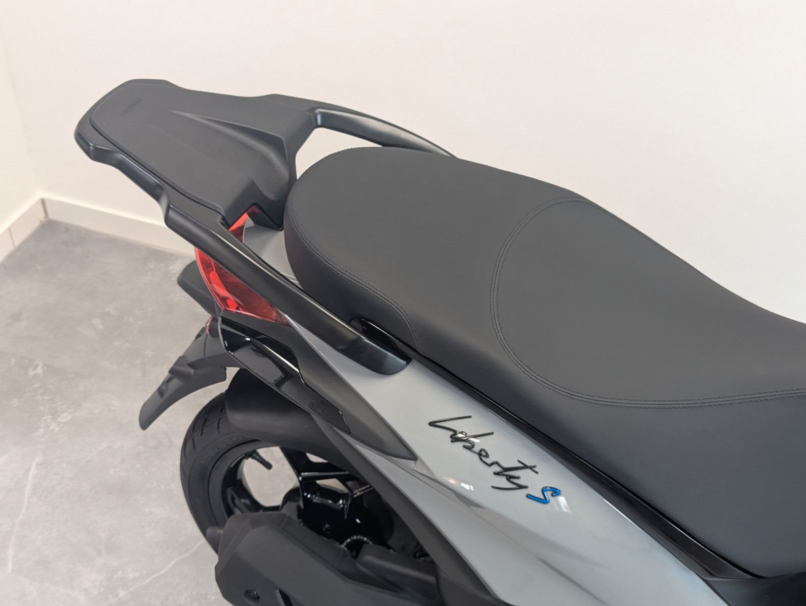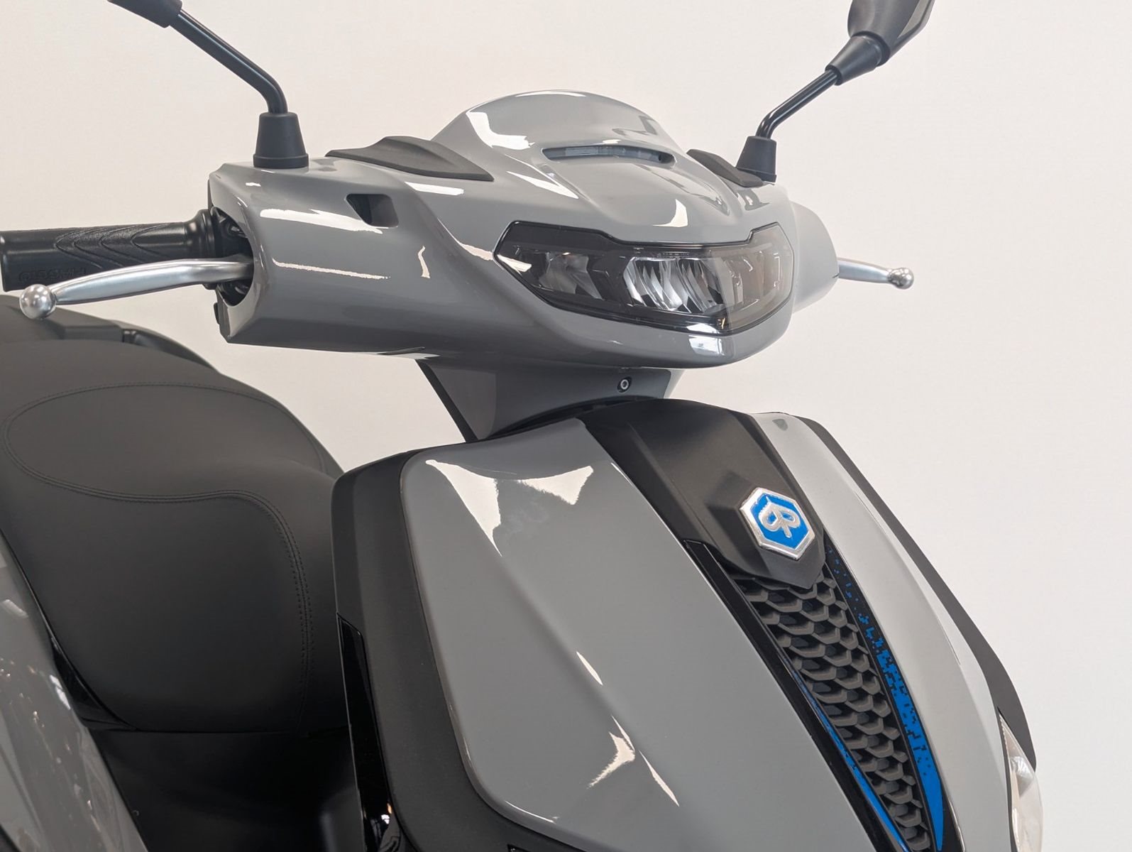 Wohl durchdacht ist die Ergonomie des Piaggio Liberty 125 S ABS ganz auf Fahrkomfort angelegt. Schön anzusehen, das schützende Frontschild mit der markanten "Krawatte" und den Blinkern mit integriertem LED Standlicht.