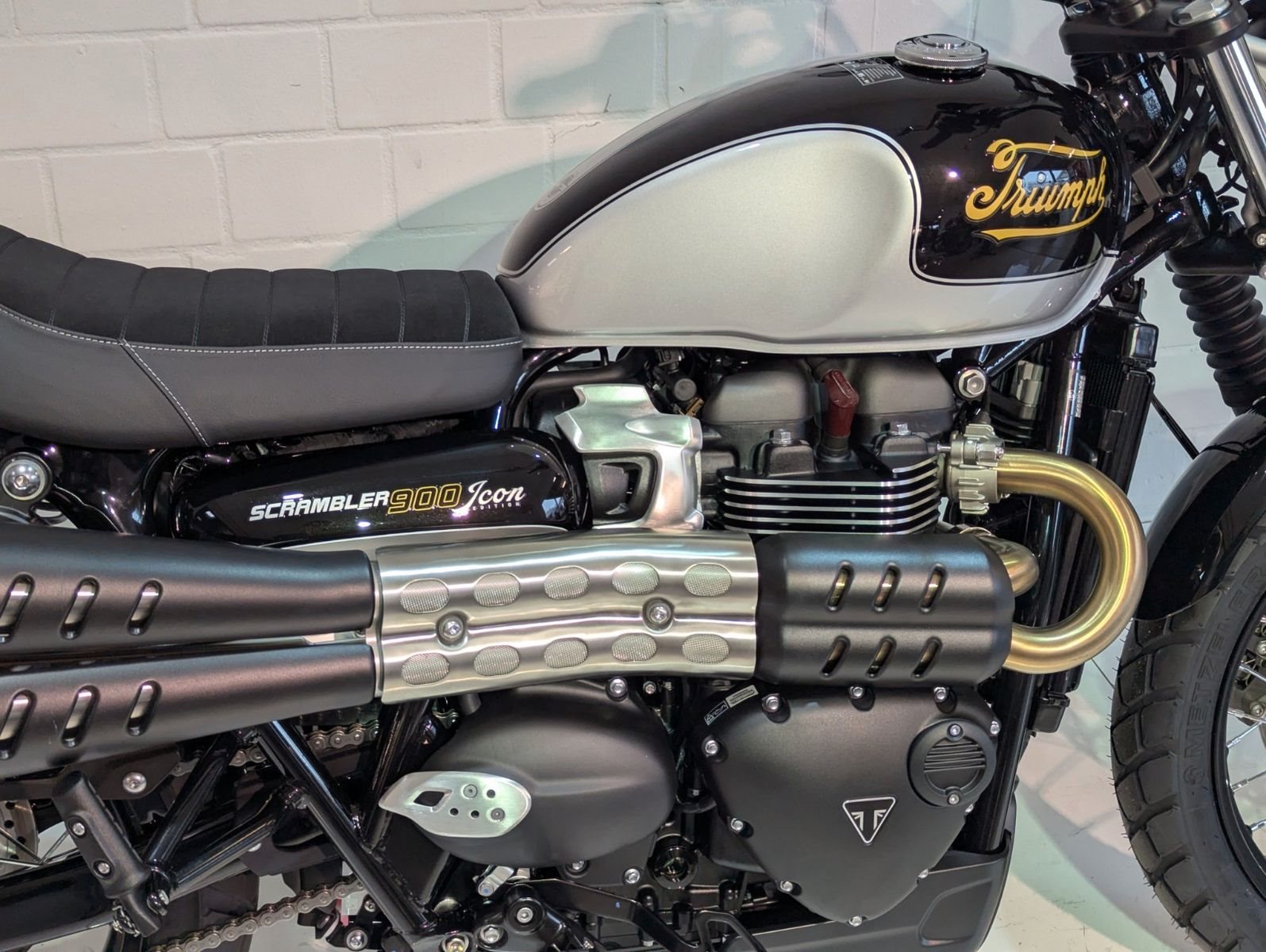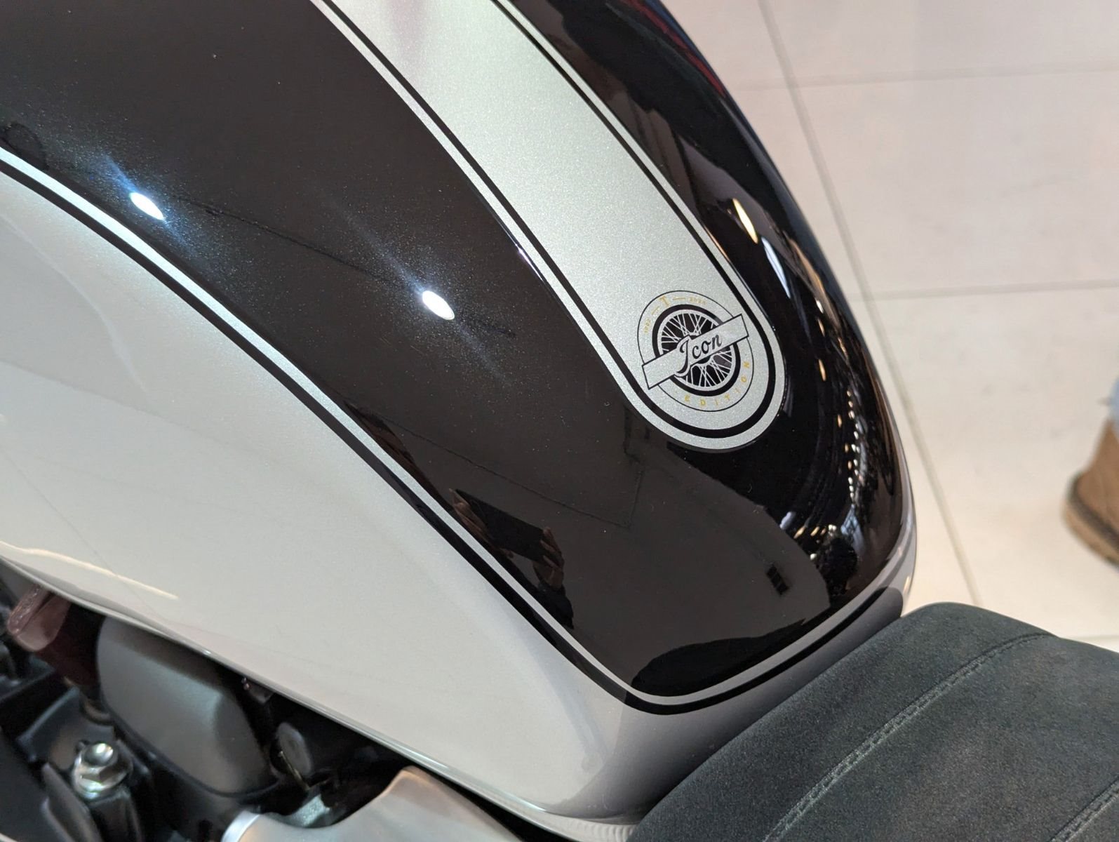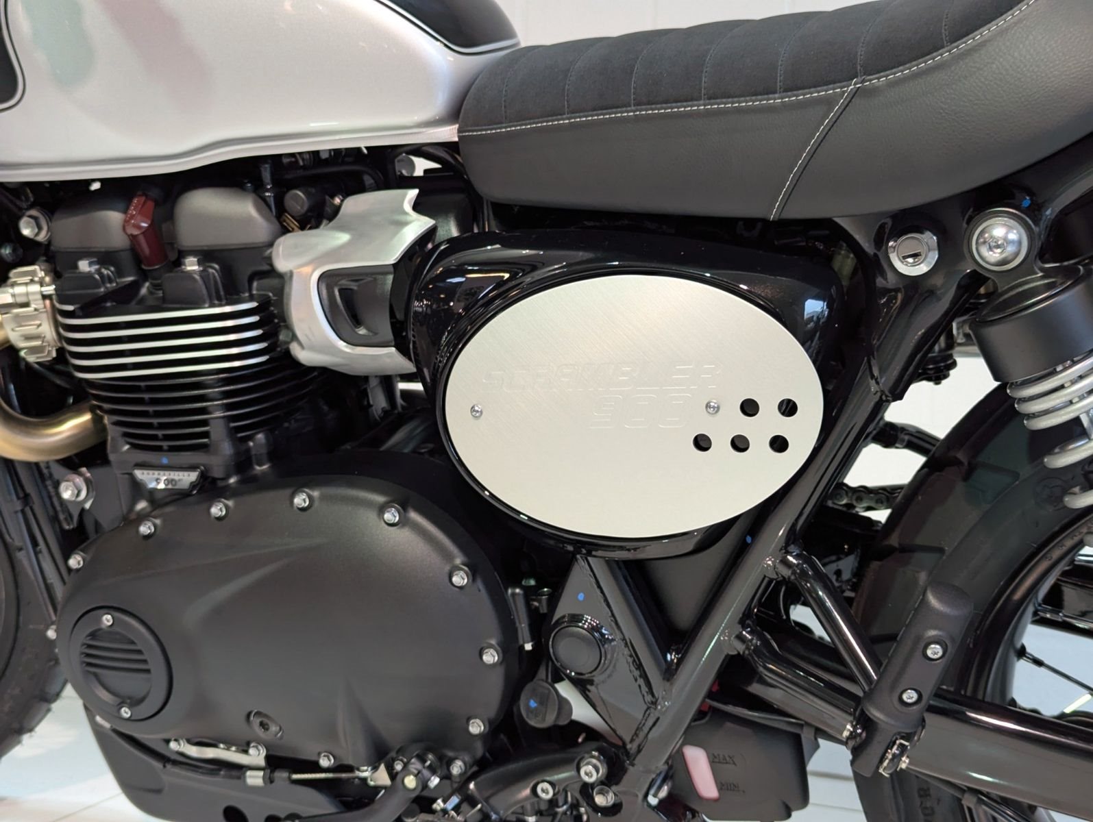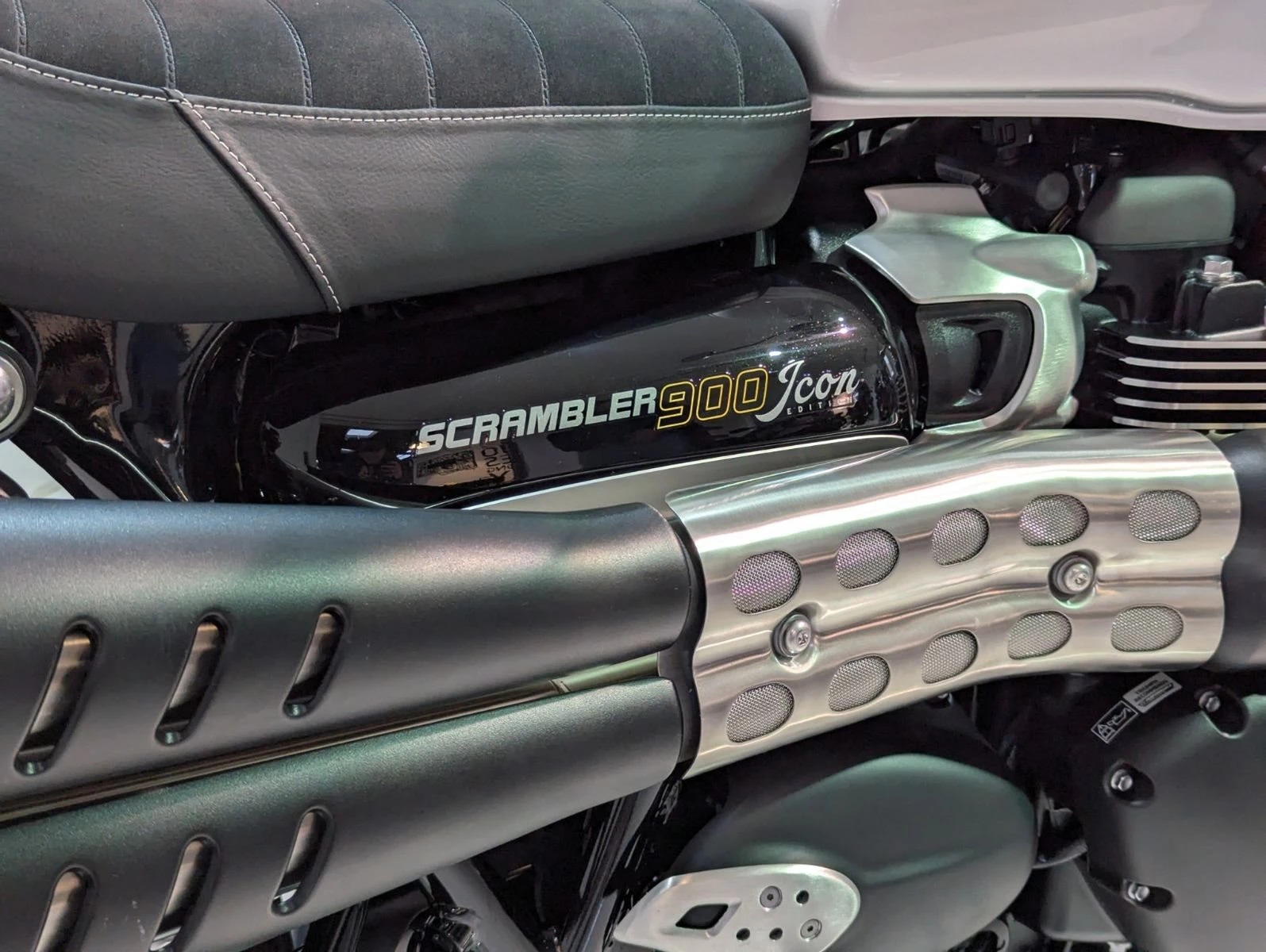 Die Farbkombination in Sapphire Black/Aluminium Silver der neuen Scrambler 900 Icon Edition verkörpert den Abenteuergeist dieses Bikes. Die kräftigen Farben des Tanks, ein Tankstreifen in Aluminium Silver mit einzigartiger Icon-Grafik und der legendäre goldene Triumph-Schriftzug von 1907 bilden einen auffälligen Kontrast zu den Seitenverkleidungen und Kotflügeln aus gebürstetem Aluminium. Der handgezogene Zierstreifen unterstreicht die markante Optik und macht das Bike zu einer hervorragenden Wahl für Fahrspaß in der Stadt und im Gelände.