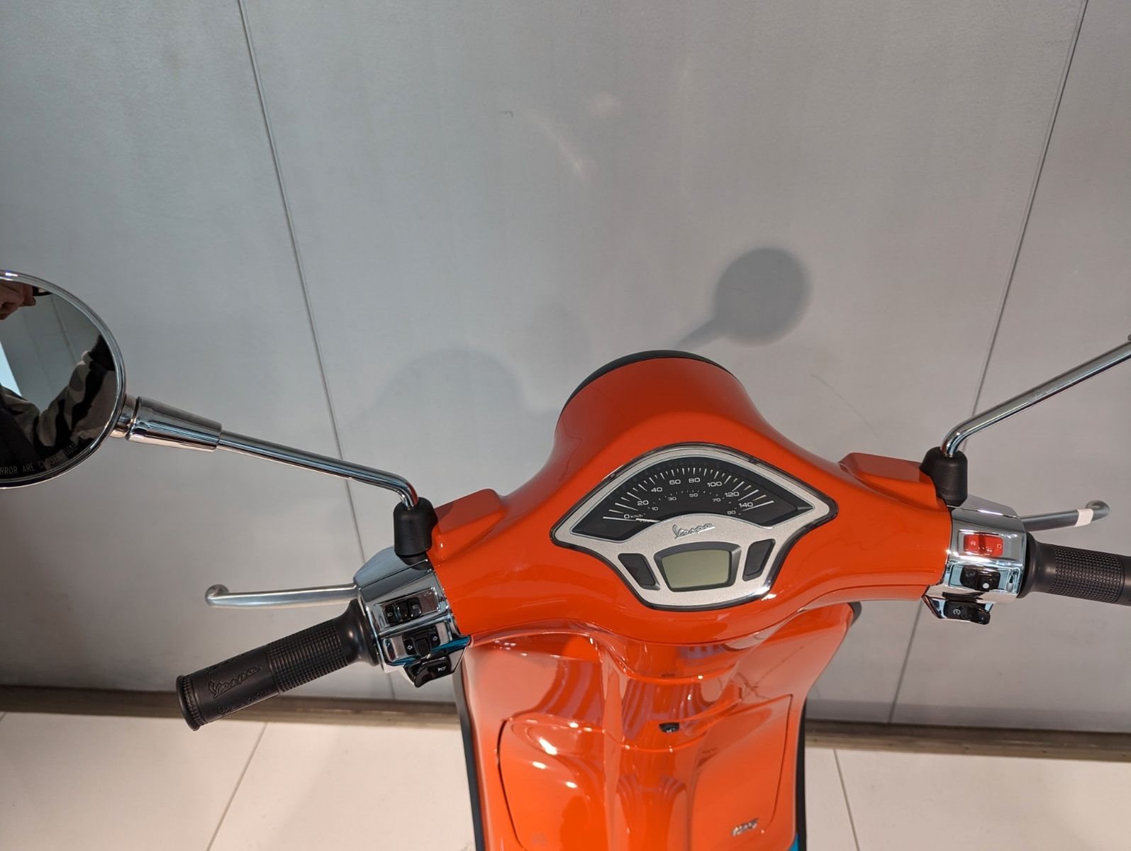 Die Vespa Primavera Color Vibe zeichnet sich durch eine spezielle Zweifarblackierung aus: Von der Karosserie, die in den Farben Orange Color Vibe und Weiß Color Vibe erhältlich ist, hebt sich das kräftige Ottanio ab, ein markanter Türkiston, in dem das Trittbrett lackiert ist. Eine schwarzgerahmte Grafik in gleichem Farbton zieht sich rechts und links diagonal vom Heck bis zur Front. Ebenfalls in Türkis sind die Schlitze der "Krawatte" sowie die mit einem Metallic-Effekt lackierten
